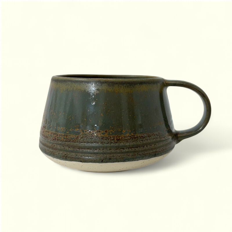 Koppen er håndlavet i stentøjsler og glaseret i en skøn mørkegrøn, glansfuld glasur med kobbernuancer. Koppen har fem små riller nederst og en bred runding mod bunden, som er hvid. Da hver enkelt kop er individuelt lavet, kan små forskelle og ujævnheder i størrelse, form og glasurudtryk forekomme.