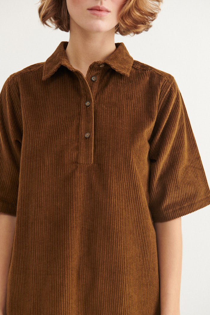 Den har korte ærmer, en løs pasform og krave med knaplukning foran, hvilket gør den behagelig at have på hele dagen. Diskrete lommer i sidesømmen giver et praktisk touch, mens den løse silhuet sikrer et elegant og ubesværet udtryk.