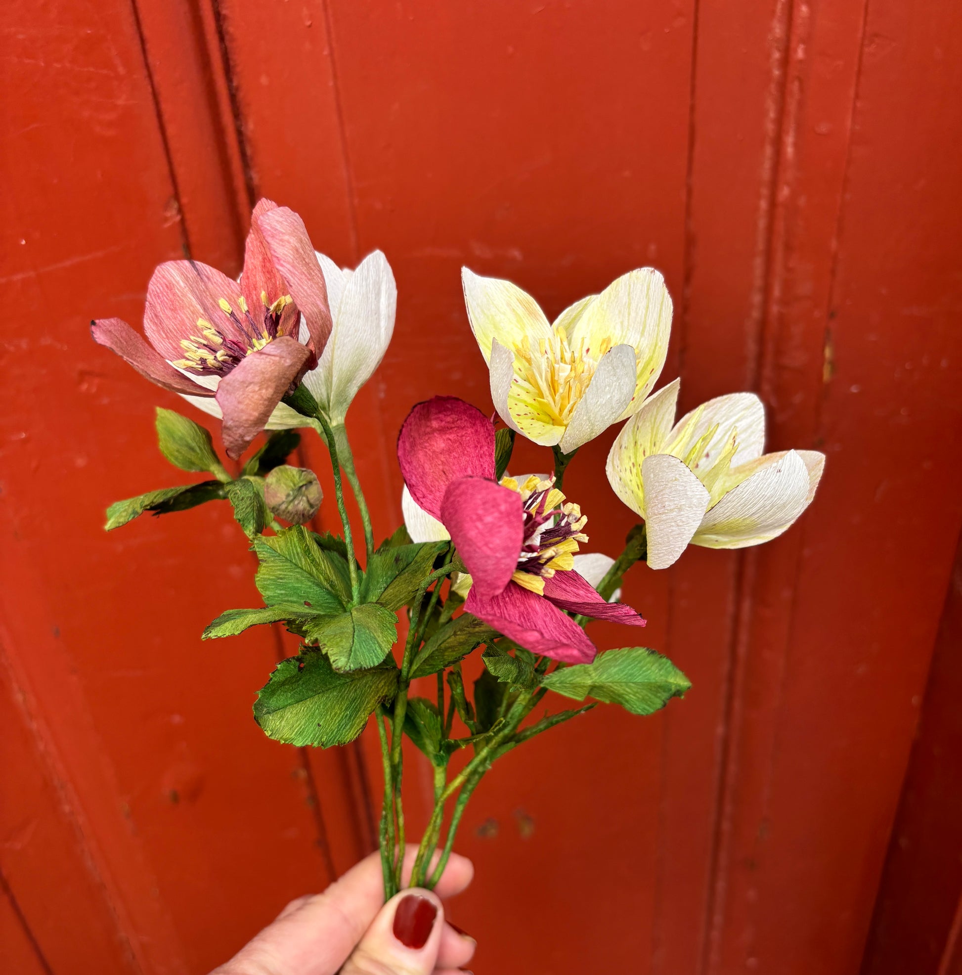 Blomsterne er håndlavede i Danmark af Louise fra Bluelou Studio og fås i en flot cremefarve og en dyb bordeaux rød nuance. Hver stilk måler ca. 22 cm og kan bruges enkeltvis eller sammensættes med andre papirsblomster i en buket, der holder år efter år.