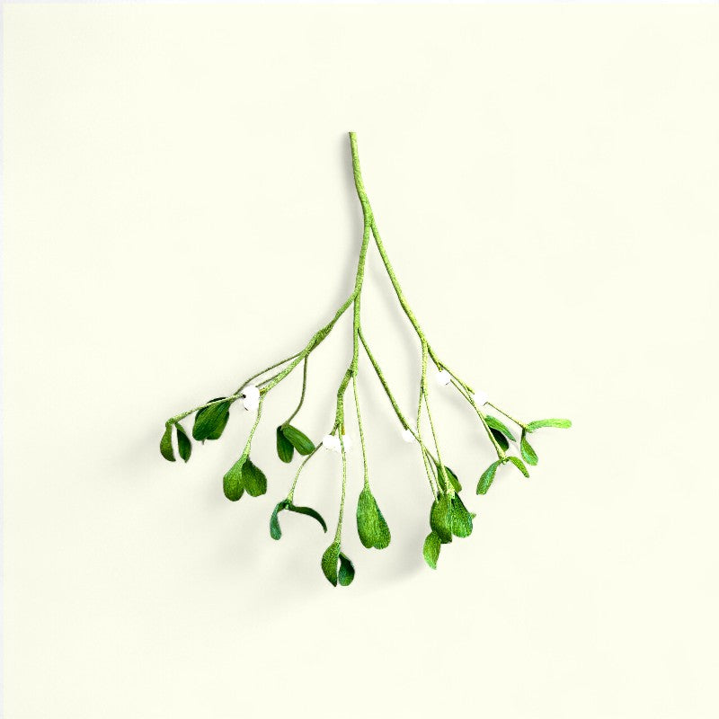 Den håndlavede Mistelten fra Bluelou Studio er en smuk og stemningsfuld fortolkning af den klassiske julemistelten. Hver gren er lavet i crepepapir og dekoreret med små hvide perler som bær, hvilket giver et elegant og naturtro udtryk.