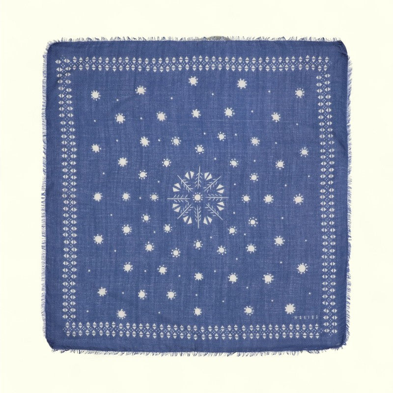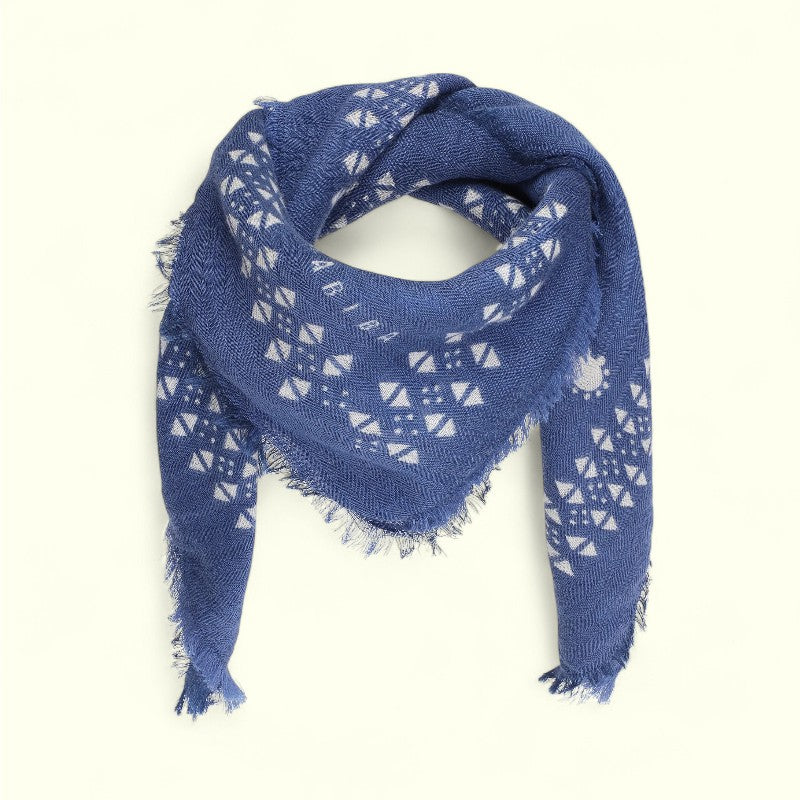 Tørklædet er trykt på en eksklusiv herringbone-vævning i en let og blød blanding af økologisk bomuld og certificeret uld (RWS – Responsible Wool Standard), hvilket giver en lun og luftig kvalitet. De rå kanter og det lille håndtegnede Habiba-logo langs kanten tilføjer en personlig og håndlavet detalje.