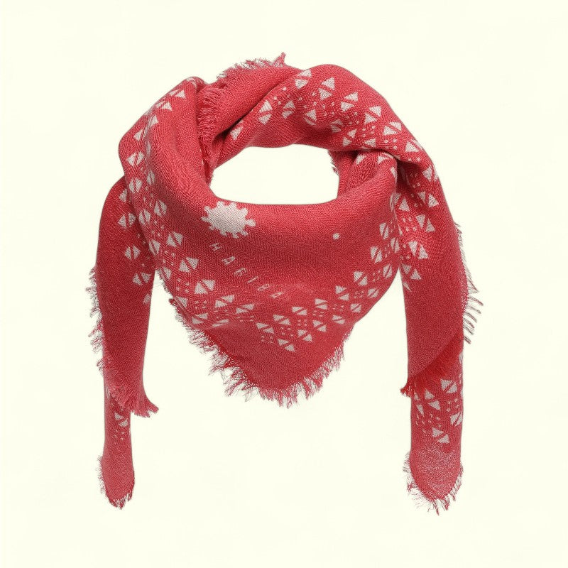 Tørklædet er trykt på en eksklusiv herringbone-vævning i en let og blød blanding af økologisk bomuld og certificeret uld (RWS – Responsible Wool Standard), hvilket giver en lun og luftig kvalitet. De rå kanter og det lille håndtegnede Habiba-logo langs kanten tilføjer en personlig og håndlavet detalje.