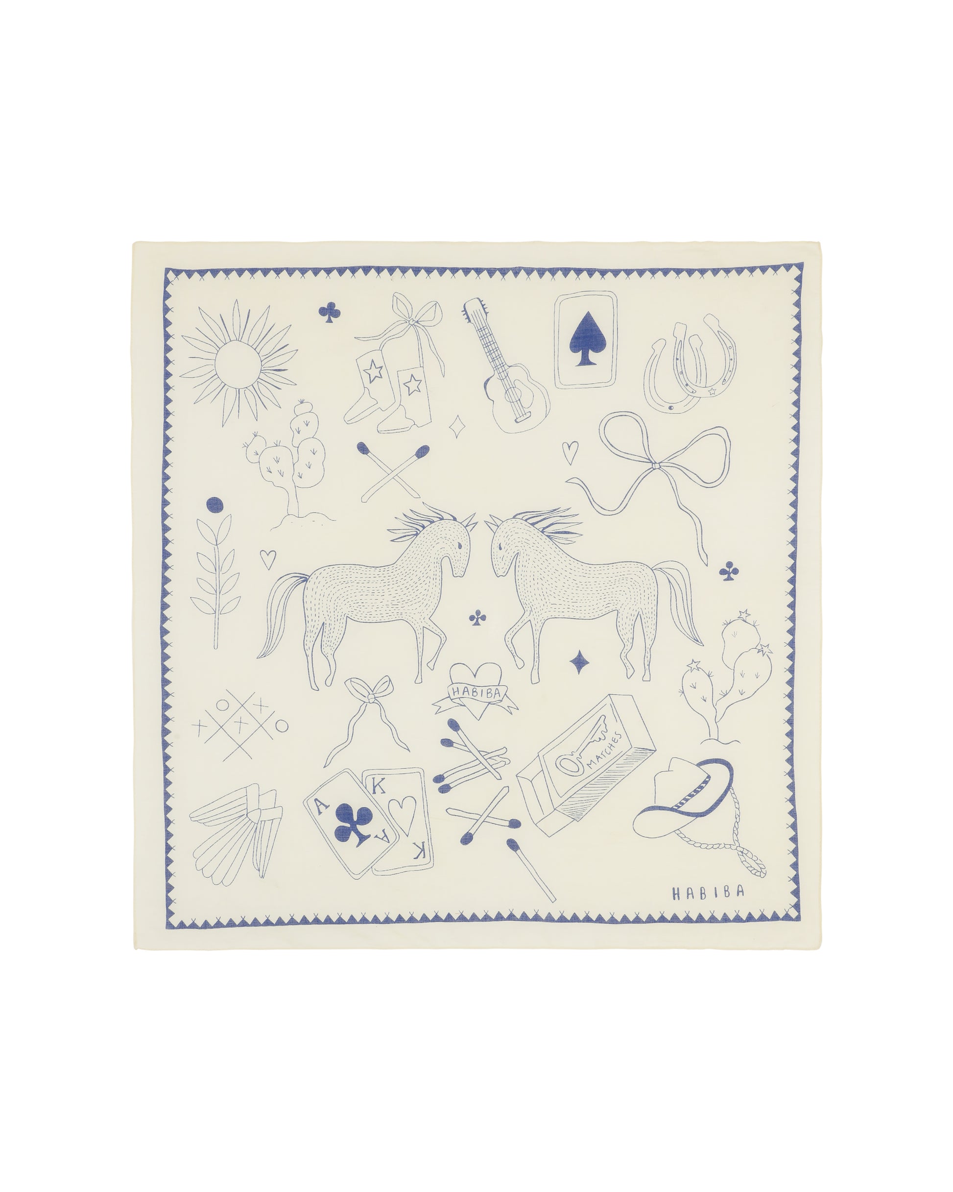 Polly Solo Bandana fra Habiba er et unikt og personligt tørklæde, inspireret af det rå og legende univers fra det vilde vesten. Det håndtegnede print gemmer på små finurlige fortællinger, der inviterer til fordybelse og giver tørklædet sit helt særlige udtryk. Den dekorative kant og det håndtegnede HABIBA-logo fuldender designet og gør hvert tørklæde til et lille stykke kunst – skabt med kærlighed.