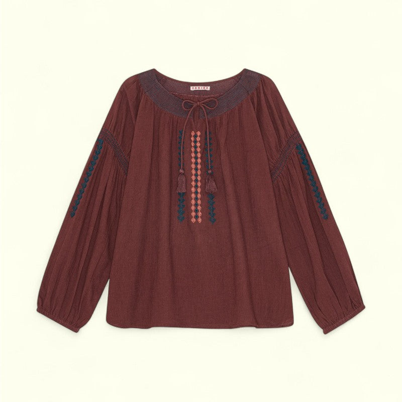Romania Blouse fra Habiba er en boheme-inspireret bluse i en dyb bordeaux nuance, der balancerer romantisk lethed med underspillet elegance. Den er syet i 100% økologisk bomuldscrepe, som giver blusen en blød tekstur og et naturligt, luftigt fald.