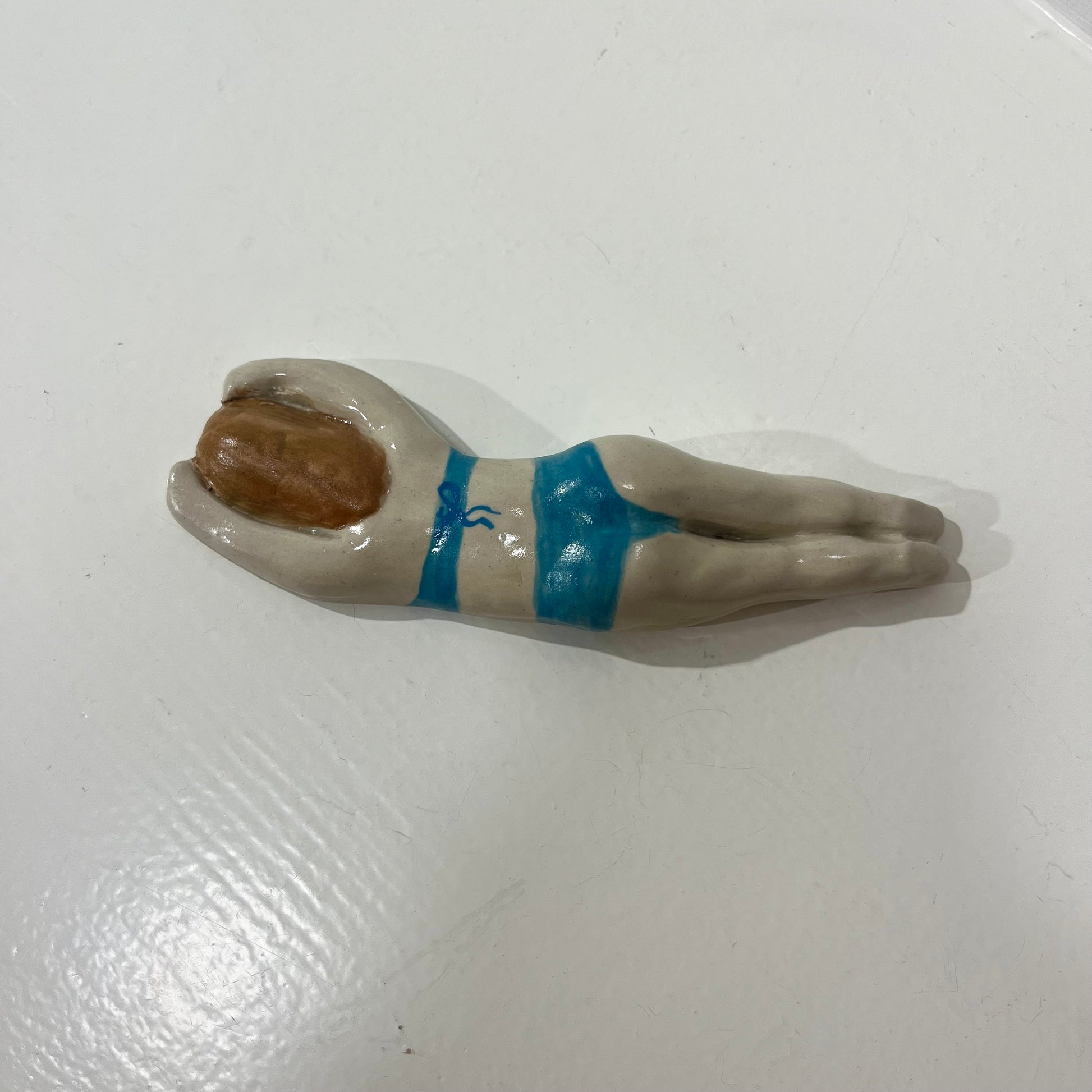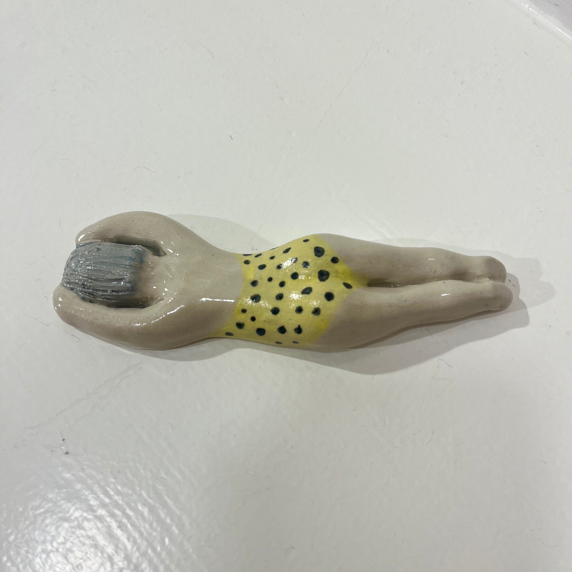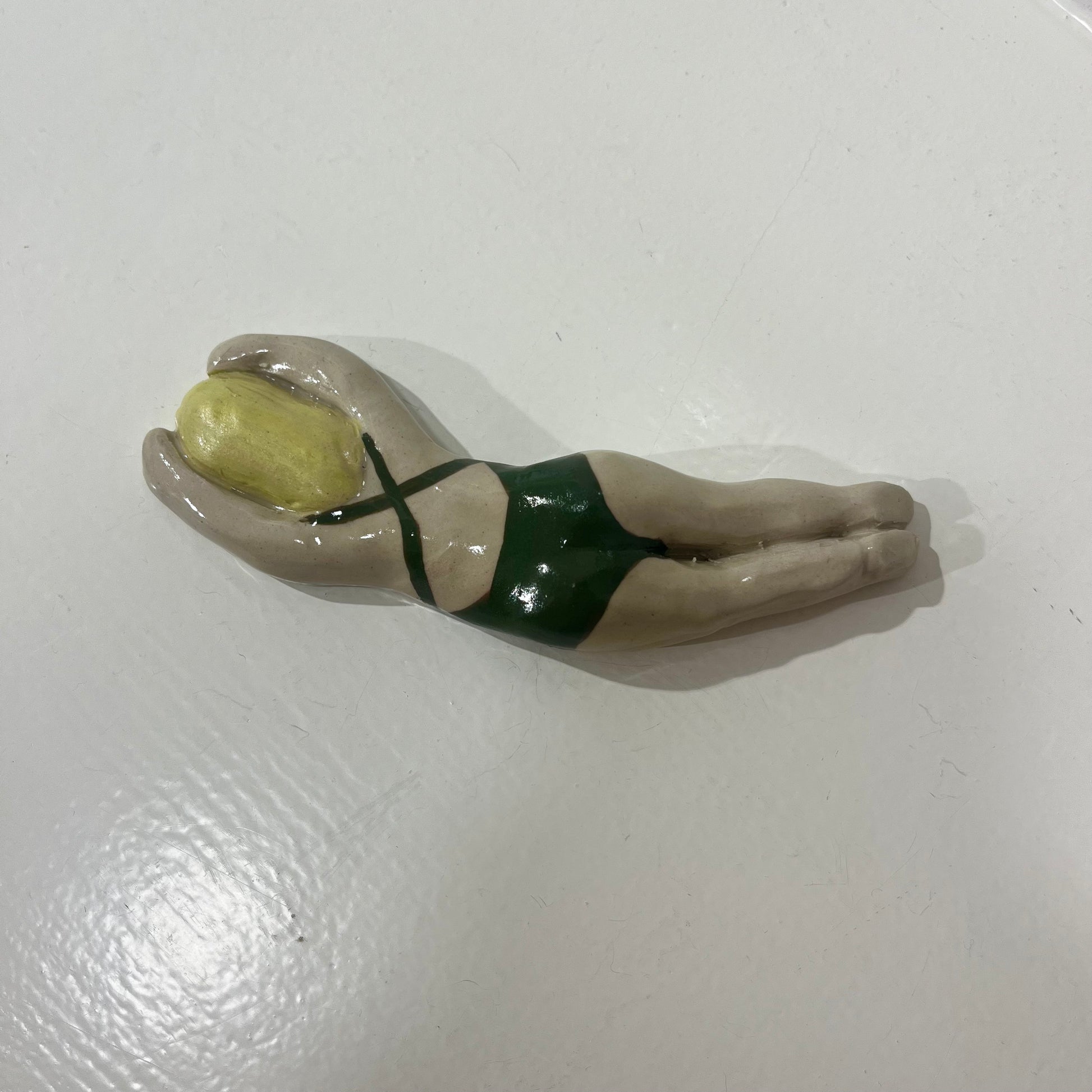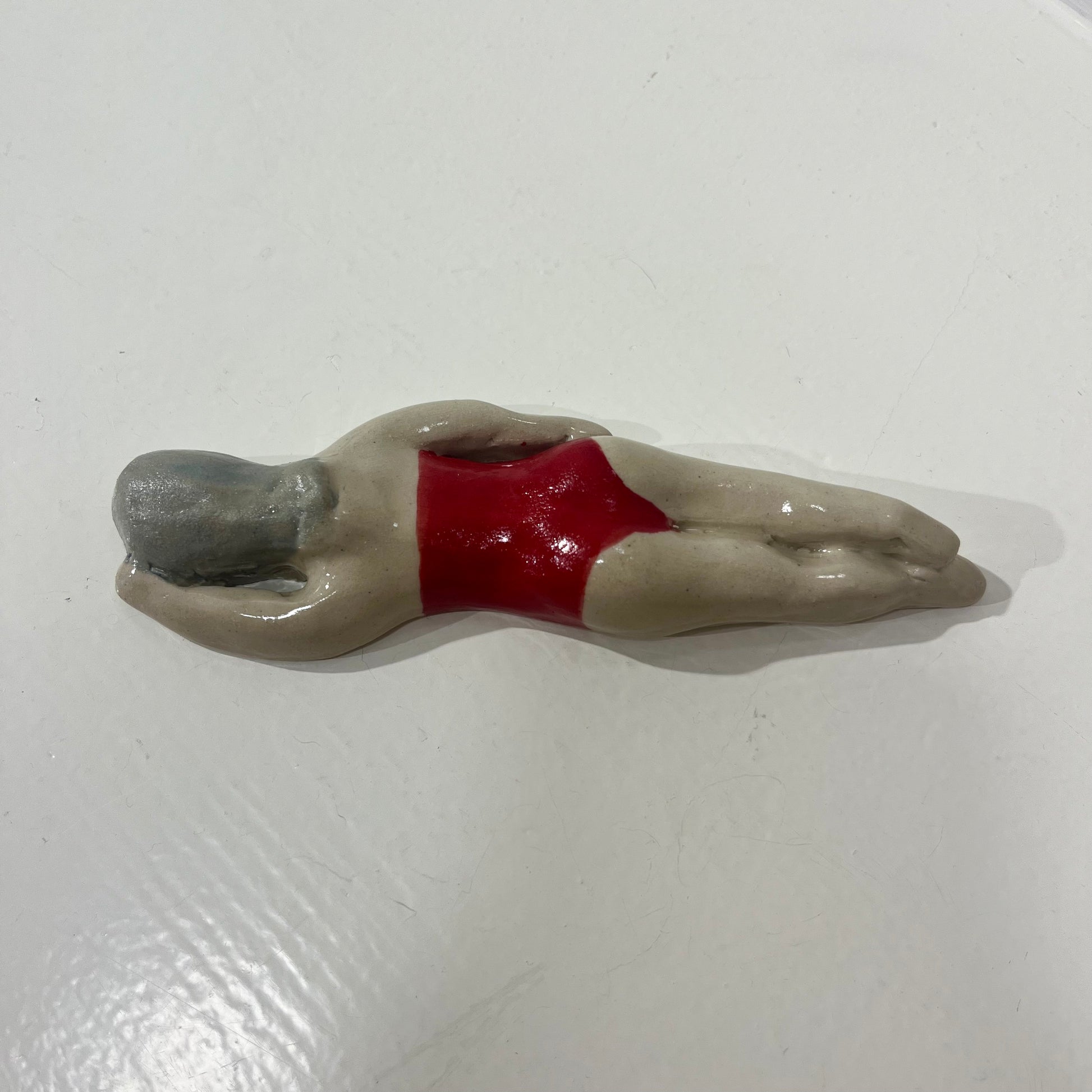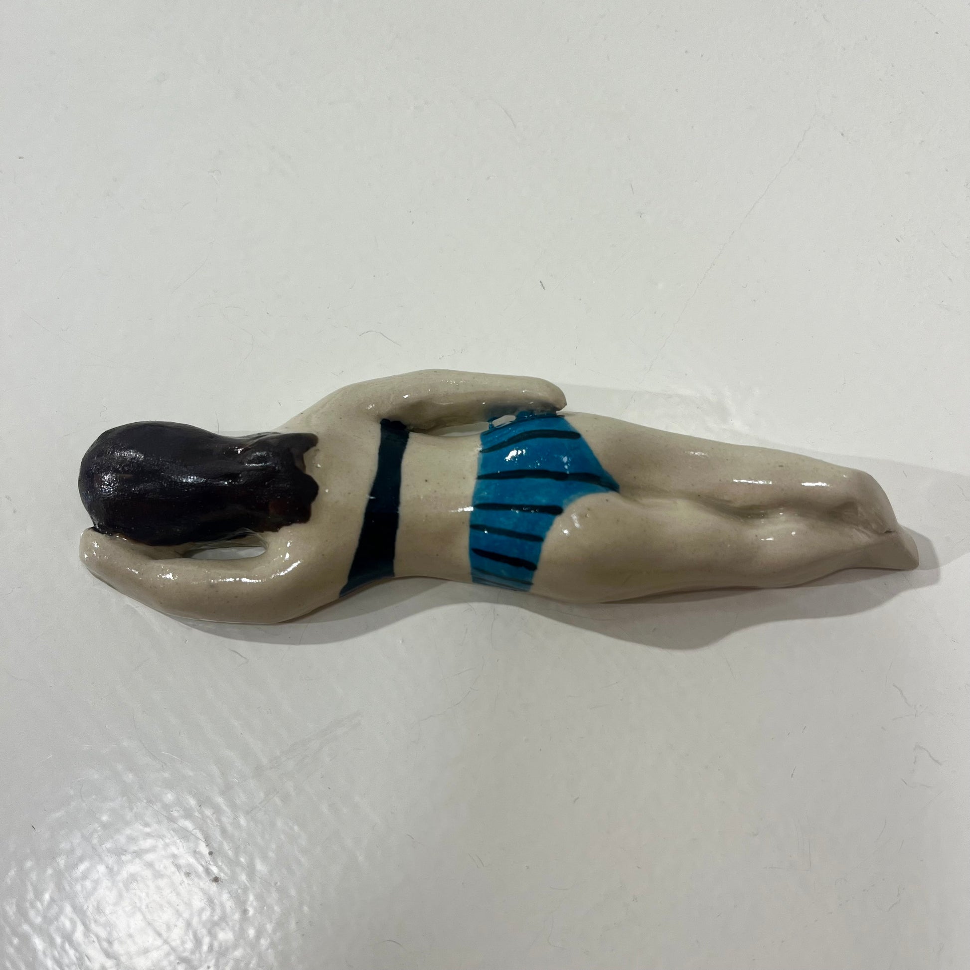 Svømme Kvinder fra færøske Havdypp X Mirrror me art er en sjov og underfundig keramikfigur, der hylder havet. Figuren kan både hænges på væggen eller placeres som en dekorativ skulptur, der bringer en følelse af ro og frihed ind i dit hjem. De organiske former og glaserede detaljer giver en taktil oplevelse, mens designet tydeligt refererer til vinterbadere og den særlige forbindelse mellem krop og hav.