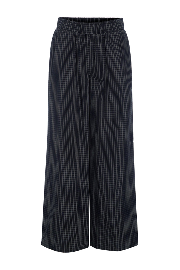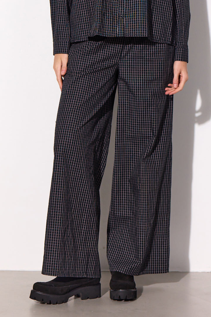 Luca Trousers Black fra HunKøn er et par afslappede bukser med brede ben og masser af komfort, skabt til dig, der elsker stil med lethed. Den elastiske talje giver en behagelig pasform, mens det bløde bomuldsstof med fint ternet mønster tilfører et underspillet, sofistikeret udtryk.