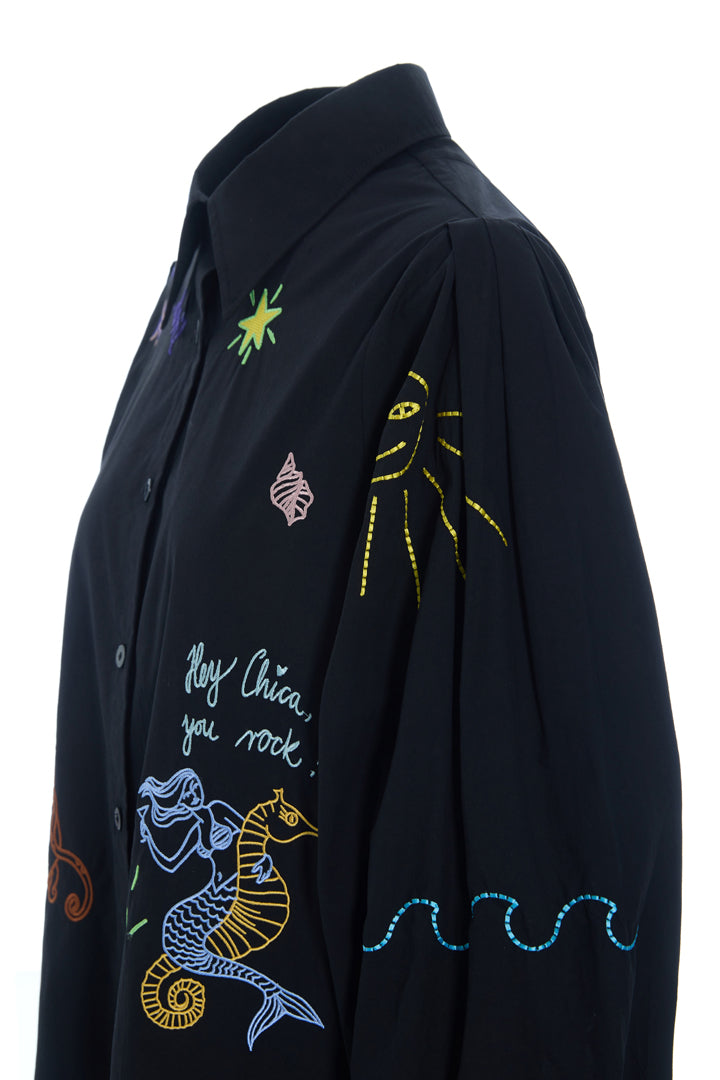 De fine læg i ryggen skaber en blød, afrundet silhuet, mens den spidse krave og den let buede søm med små slidser i siderne tilfører skjorten et elegant og gennemtænkt design. De farverige broderier giver et unikt og karakterfuldt udtryk, som gør skjorten til et særligt statement-piece i garderoben.