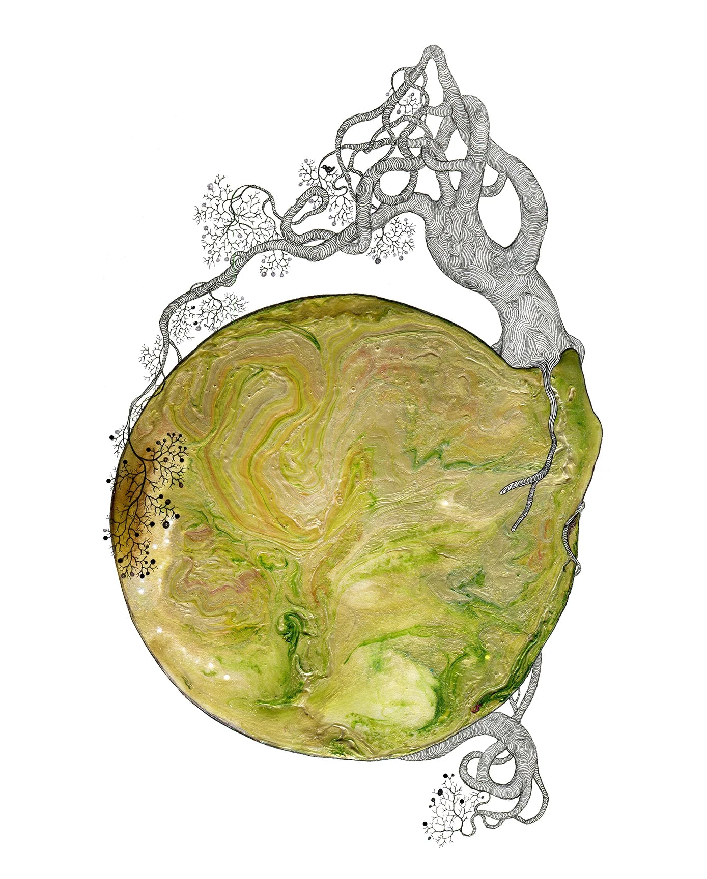 Ny Verden #223 er et unikt kunsttryk af Joanna Jensen, skabt med akvarel og fineliner kuglepenne. Værket kombinerer det lette og transparente fra akvarellen med de skarpe detaljer fra fineliner, hvilket giver en særlig dybde og poetisk balance i motivet.