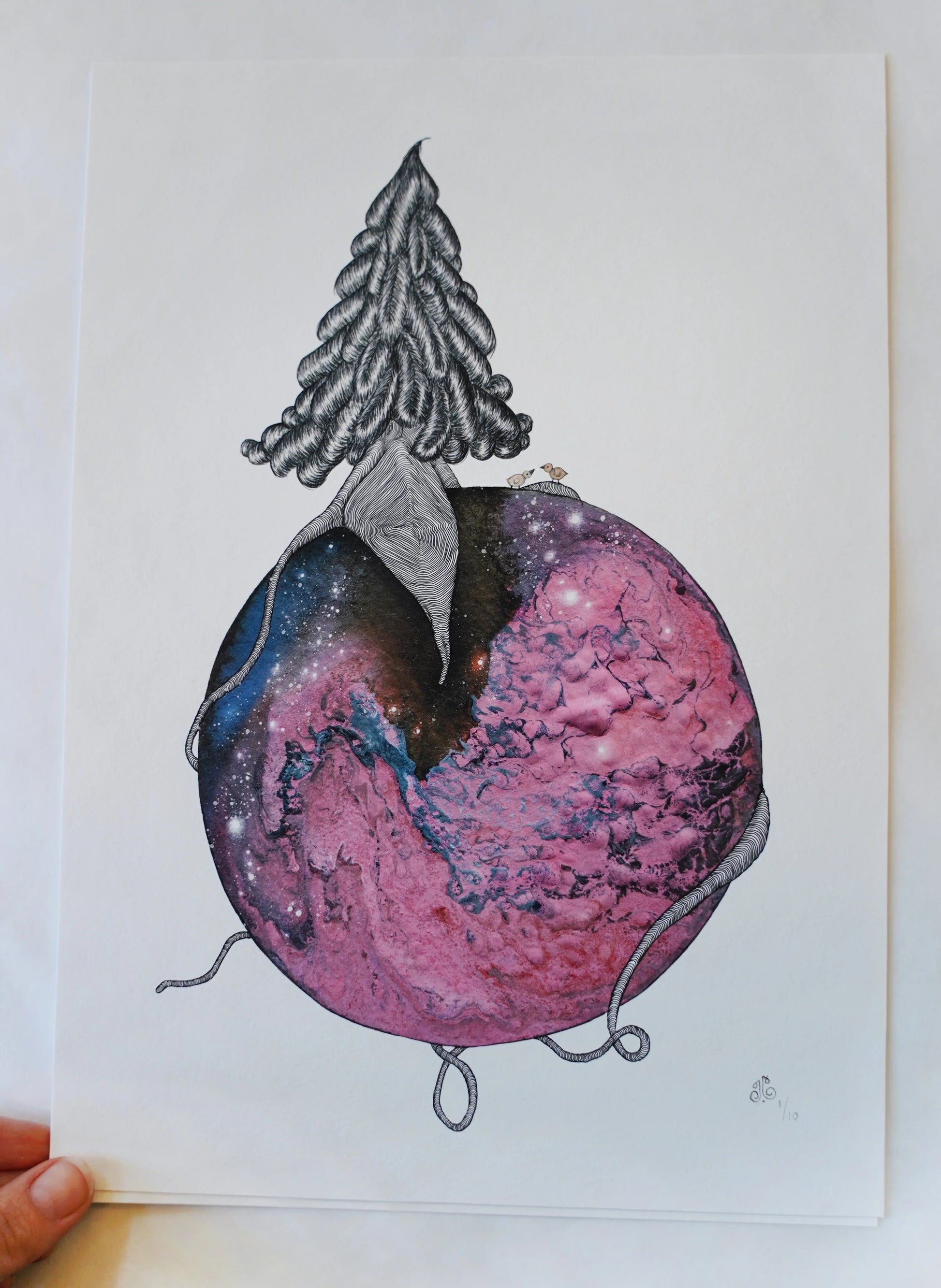Malet med akvarel og fineliner kuglepenne.- Str. A4