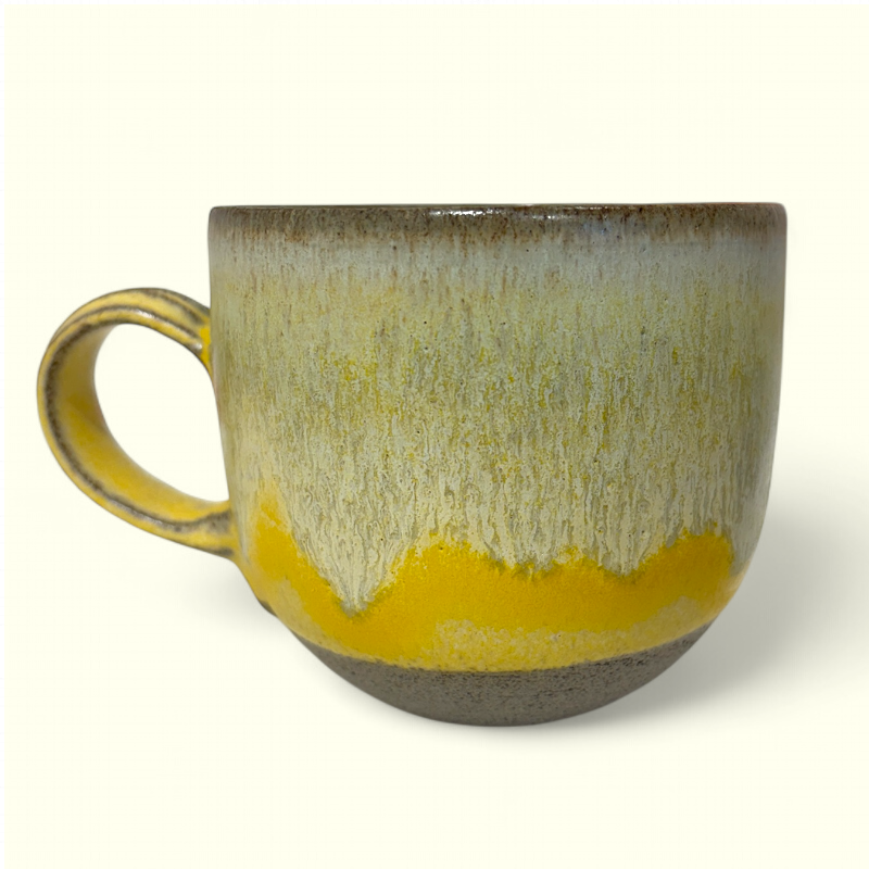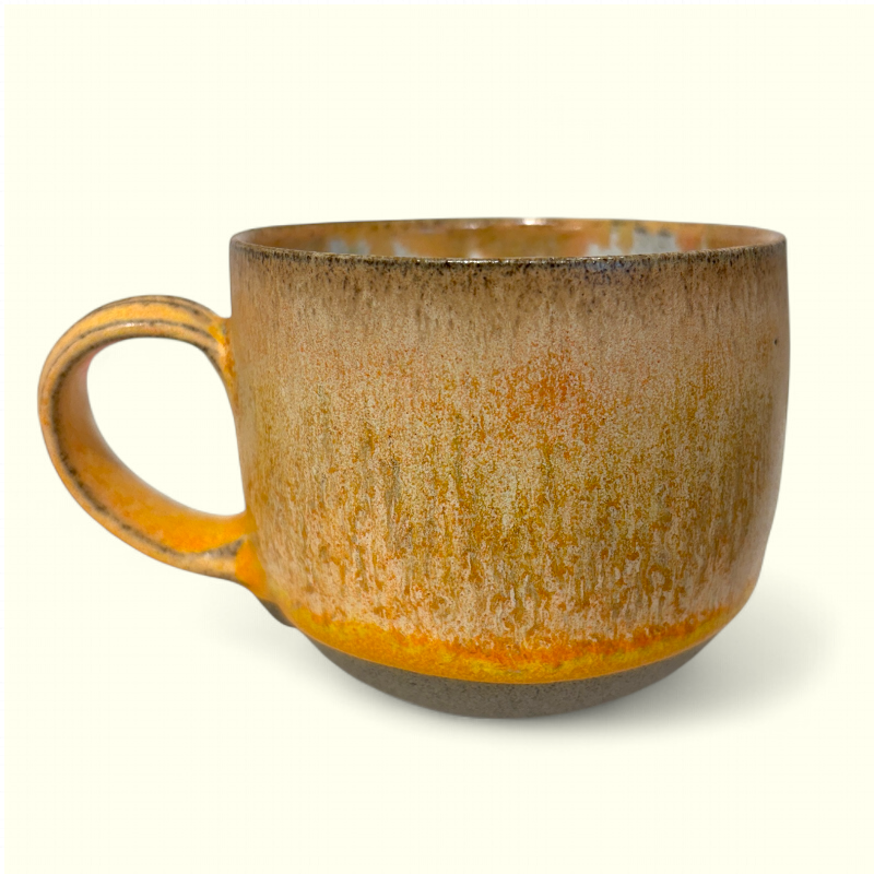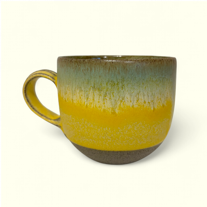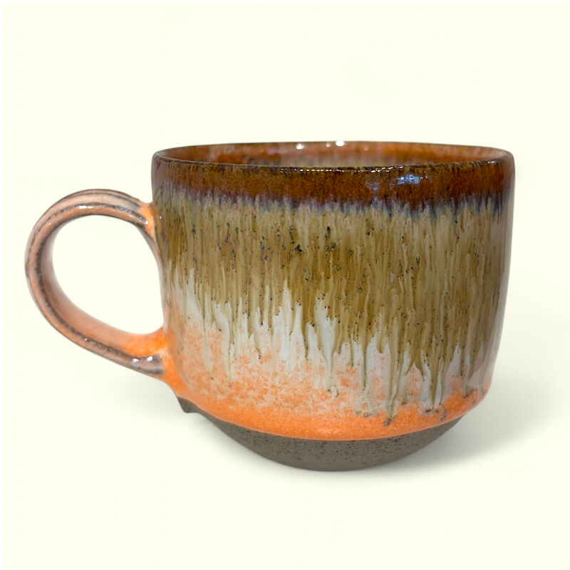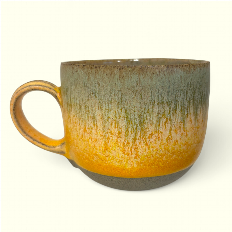 Denne smukke kop med hank fra Keis & Fiedler er hånddrejet i stentøj og glaseret i flotte, levende farver, der giver hver kop sit helt unikke udtryk. Undersiden står i råt stentøjsler, så du kan mærke kontrasten mellem den glatte glasur og det naturlige ler – en sanselig detalje, der understreger det håndlavede præg.
