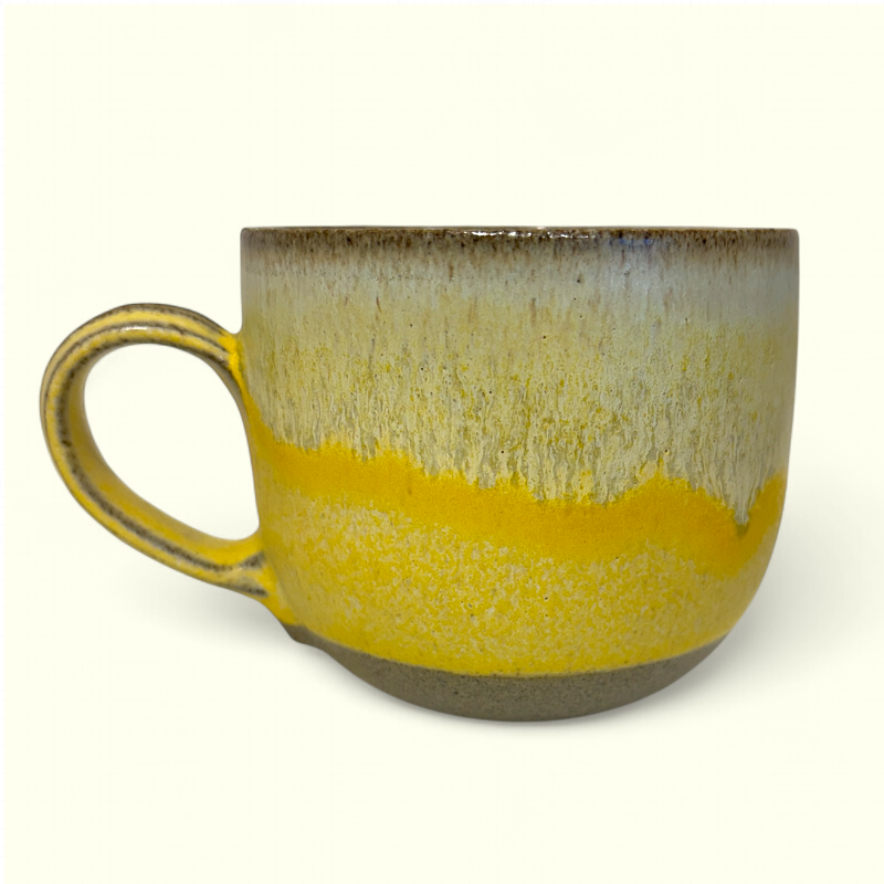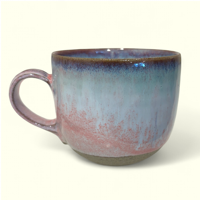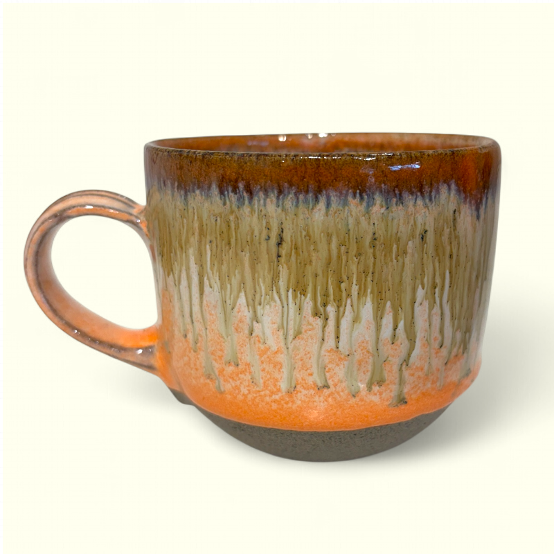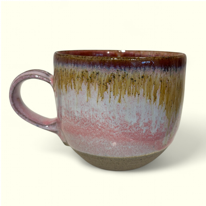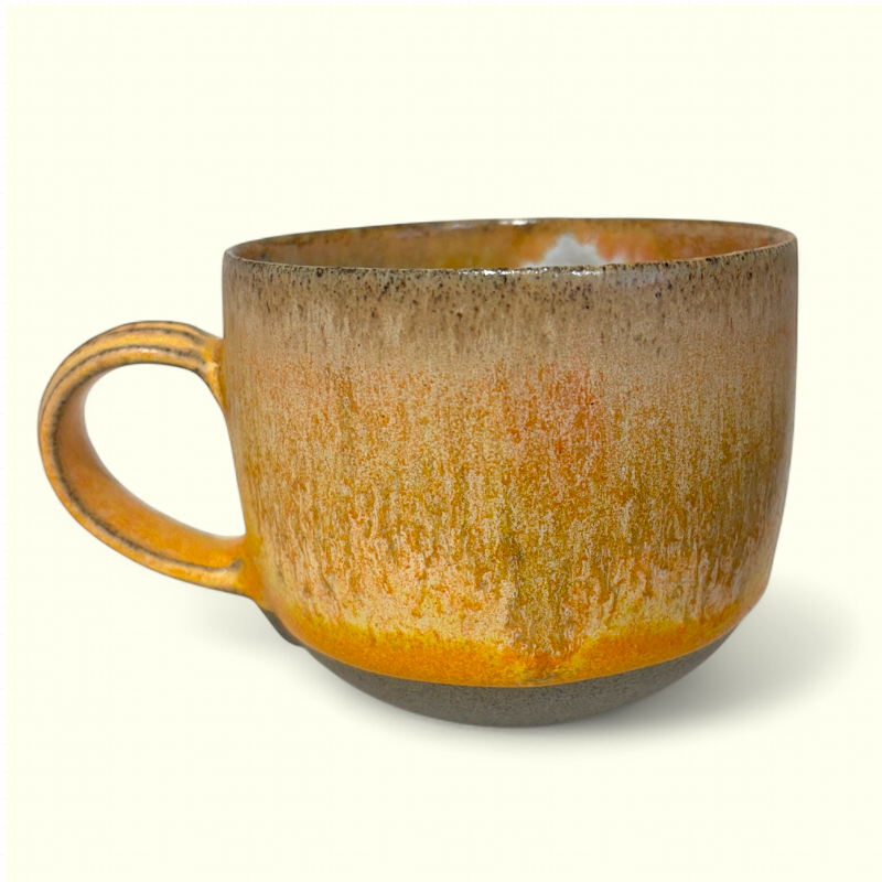 Denne smukke kop med hank fra Keis & Fiedler er hånddrejet i stentøj og glaseret i flotte, levende farver, der giver hver kop sit helt unikke udtryk. Undersiden står i råt stentøjsler, så du kan mærke kontrasten mellem den glatte glasur og det naturlige ler – en sanselig detalje, der understreger det håndlavede præg.