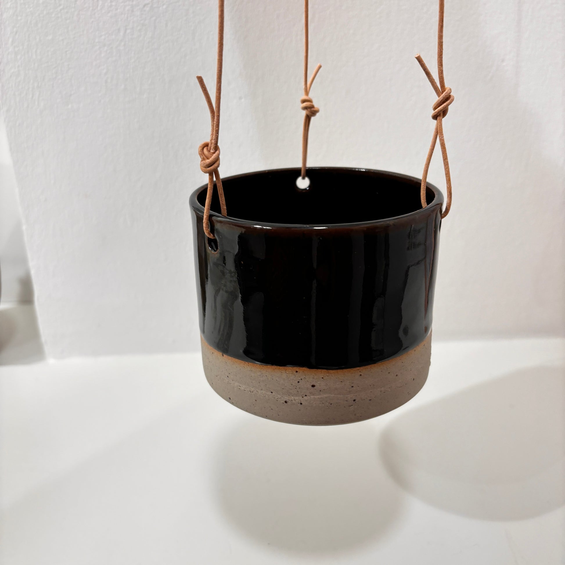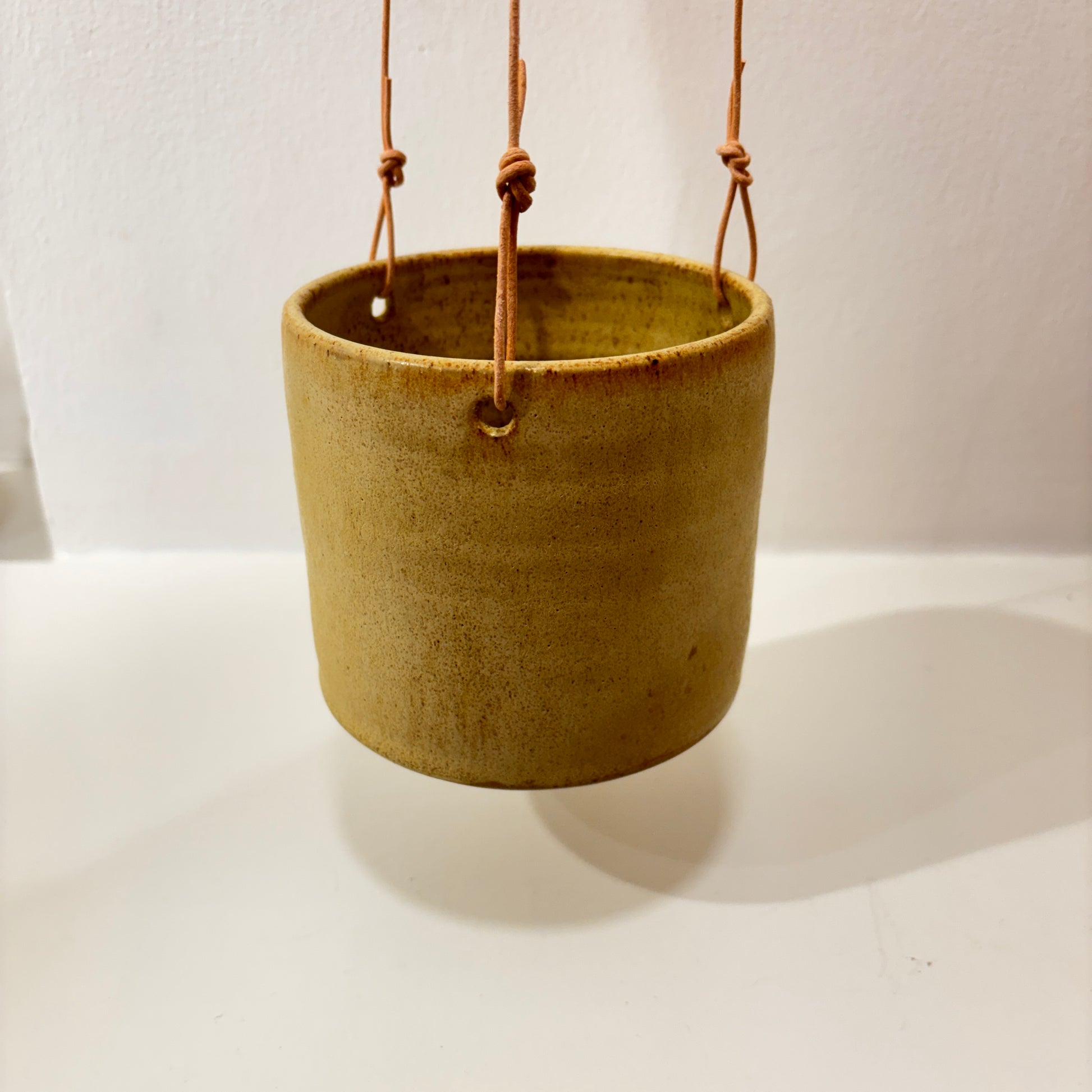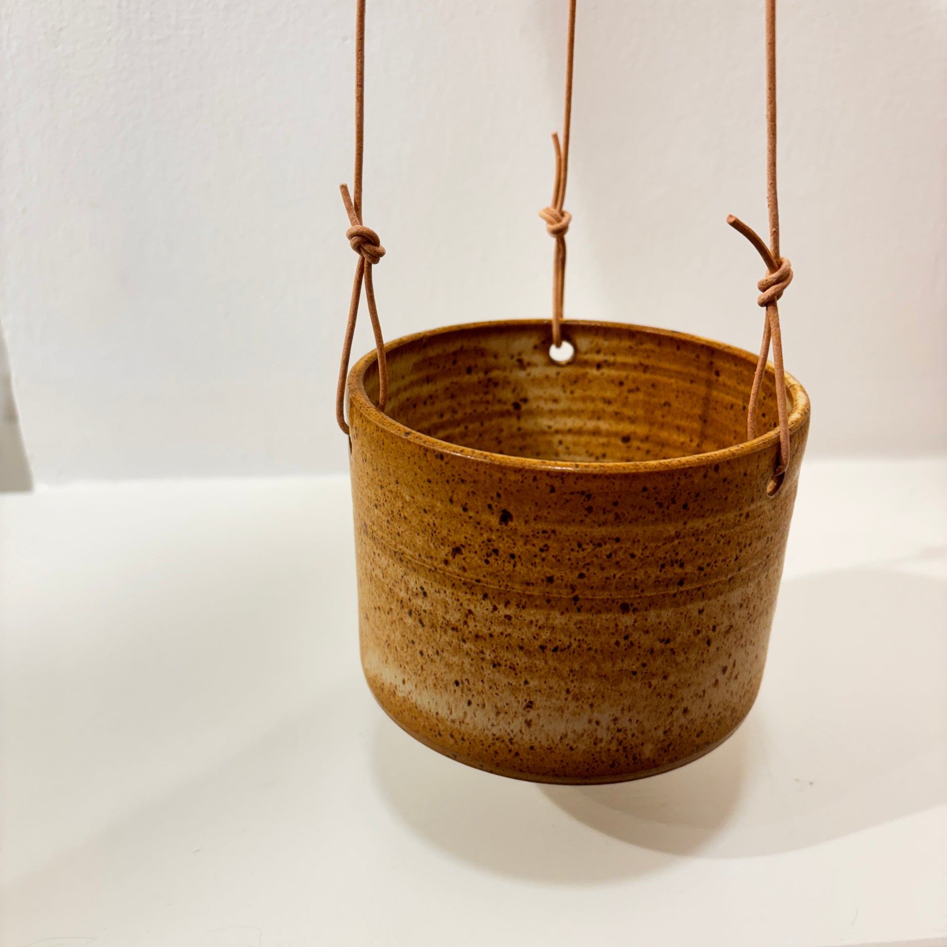 Denne håndlavede hængeurtepotte er skabt af keramiker Anna fra Lerbruket Studio. Med et unikt design og fremstillet af overskydende ler fra Annas undervisningsarbejde, er ingen urtepotter ens. Den hænger i smukke naturlæder snore og er perfekt til krydderurter, løg eller andre planter – eller hvad end du synes passer ind i din boligindretning.