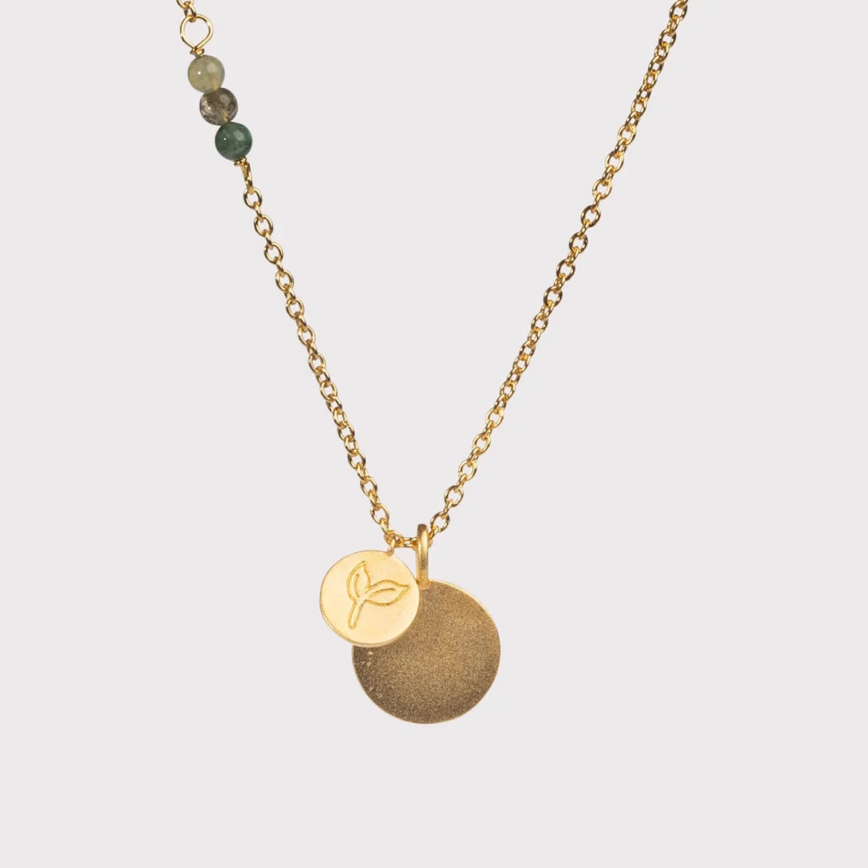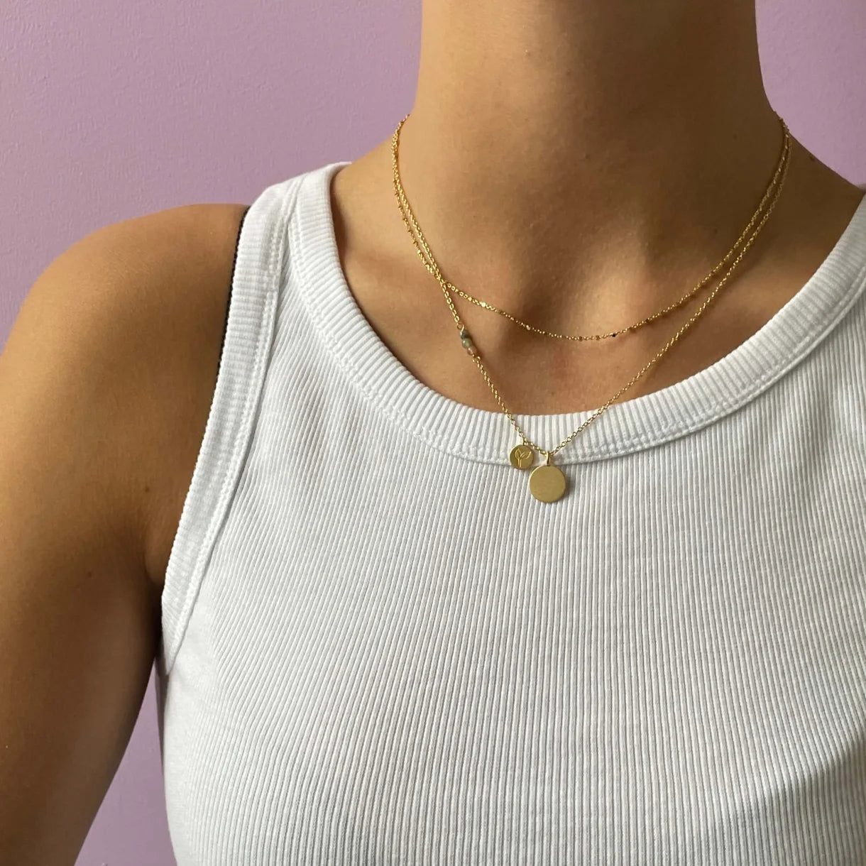 Vi er helt forelsket i vores fine Gro Voksen Halskæde, som har de smukkeste detaljer. Du får en klassisk og enkel kæde, som har tre små indiske agater i 3 mm. De kan variere en smule i farvetonen. Desuden har Gro Voksen Halskæde to runde vedhæng i to forskellige størrelser. På det ene vedhæng er der en lille spise på en glad overflade, mens det andet vedhæng har en matteret overflade, hvor man kan få indgraveret et navn eller dato. Halskæden ligger utrolig flot på halsen med dens fine og unikke detaljer.