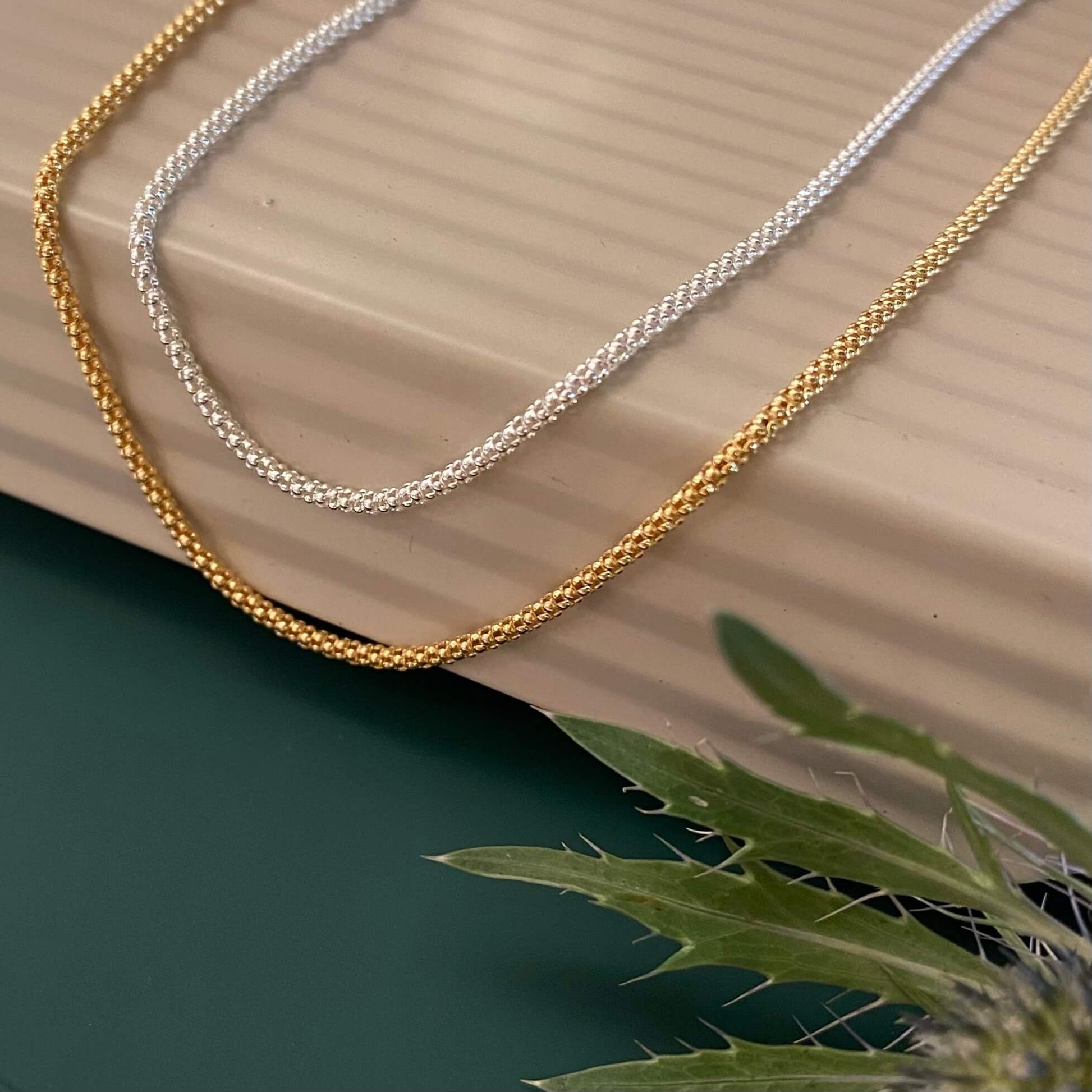 Popcorn halskæden fra Lone P er en elegant og enkel kæde med et unikt, let "poppet" udtryk, der giver den sit karakteristiske navn. Den snoede struktur skaber en smuk glans, som gør halskæden iøjnefaldende, selv når den bæres alene.