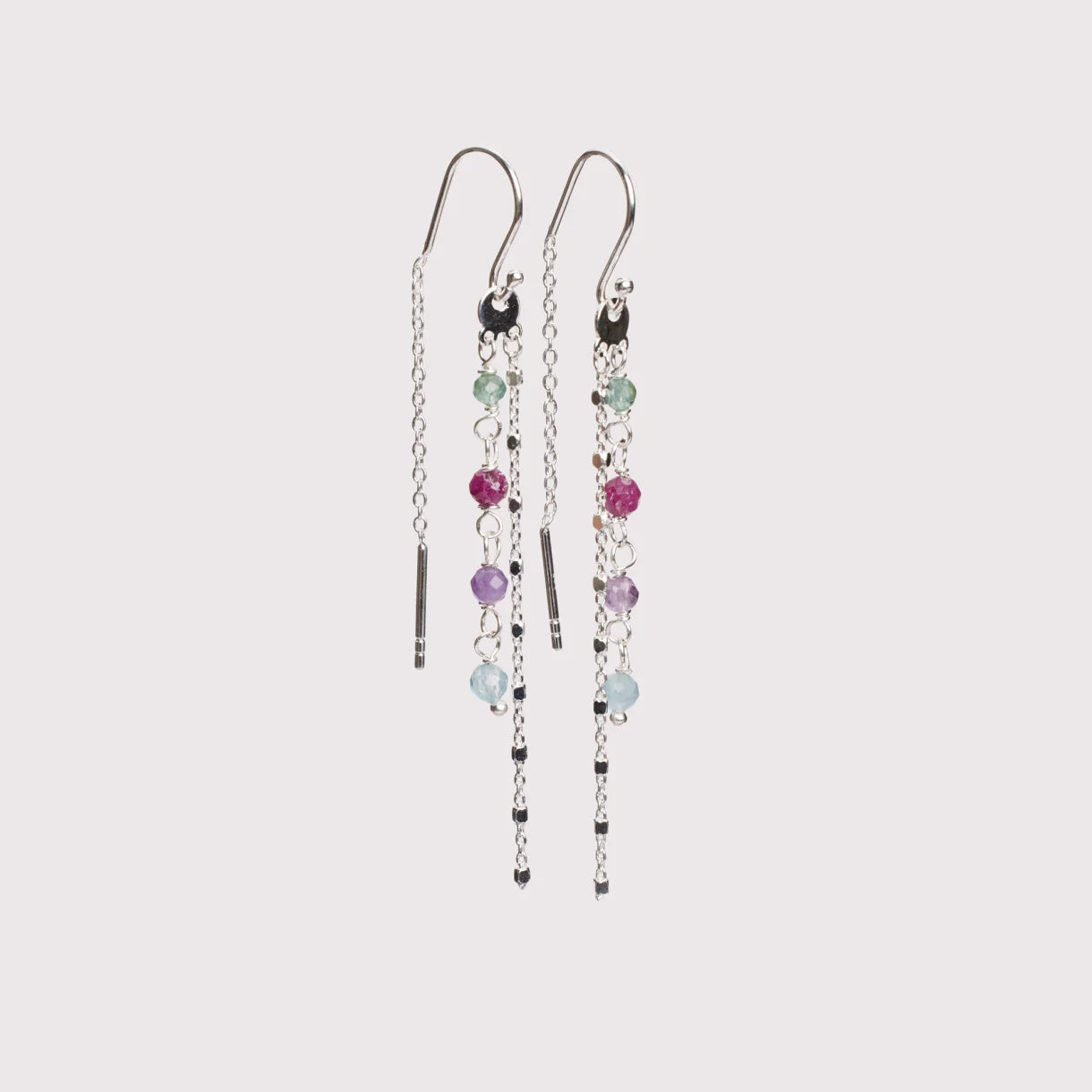 Øresmykke med tre forskellige kæder, den ene kæde består af 4 små krystaller.