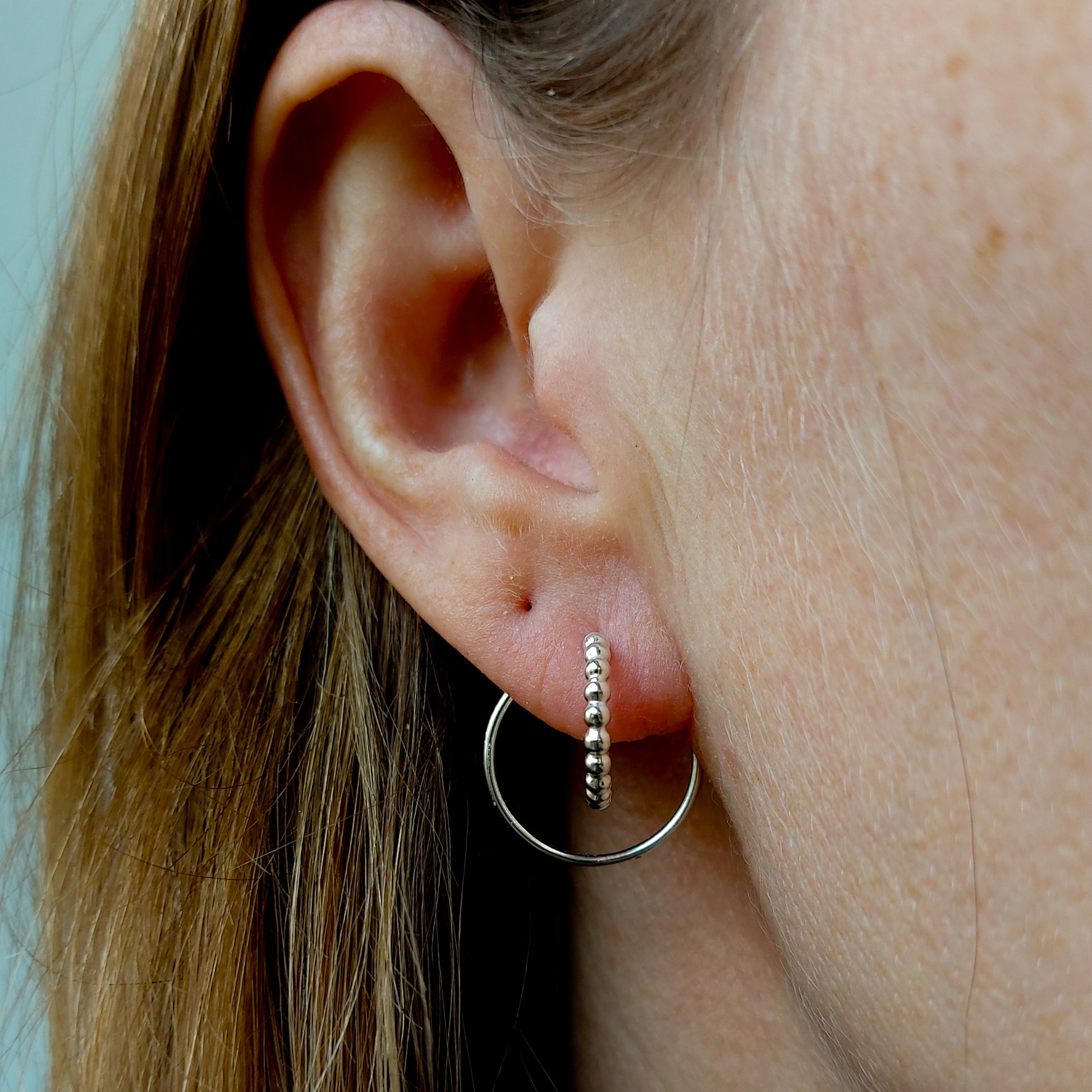 Dette er en variant af onepiece øreringene, hvor trådcirklen fungerer som lås. Du undgår dermed en lås, der stikker og generer. Hele cirklen skal igennem øret. Der er en højre og venstre - åbningen på tråden skal vende ind mod kinden, når øreringen sidder i øret. Prisen er for et par.