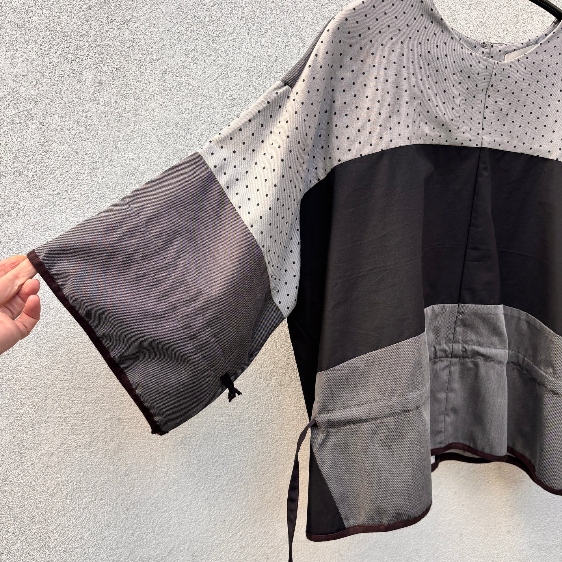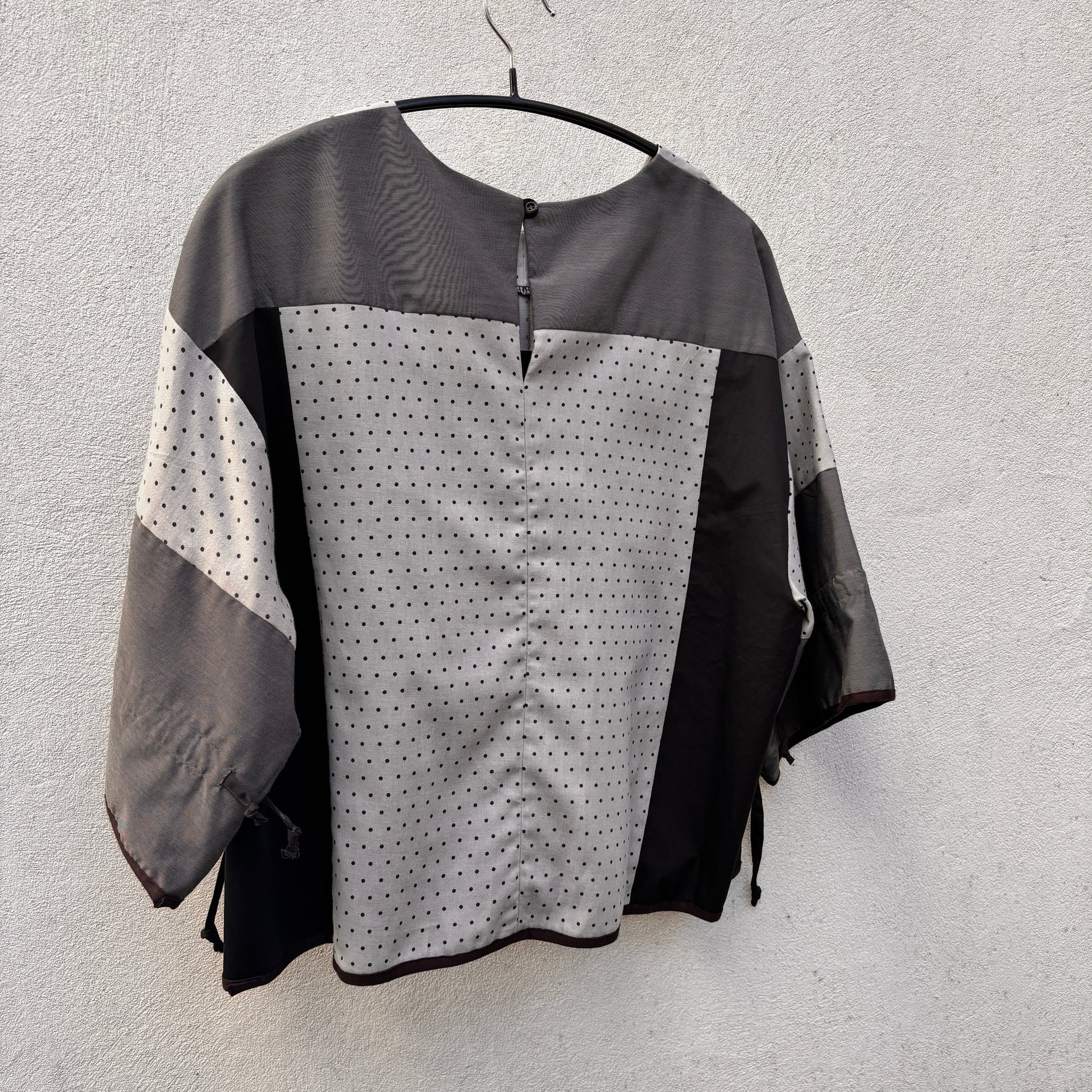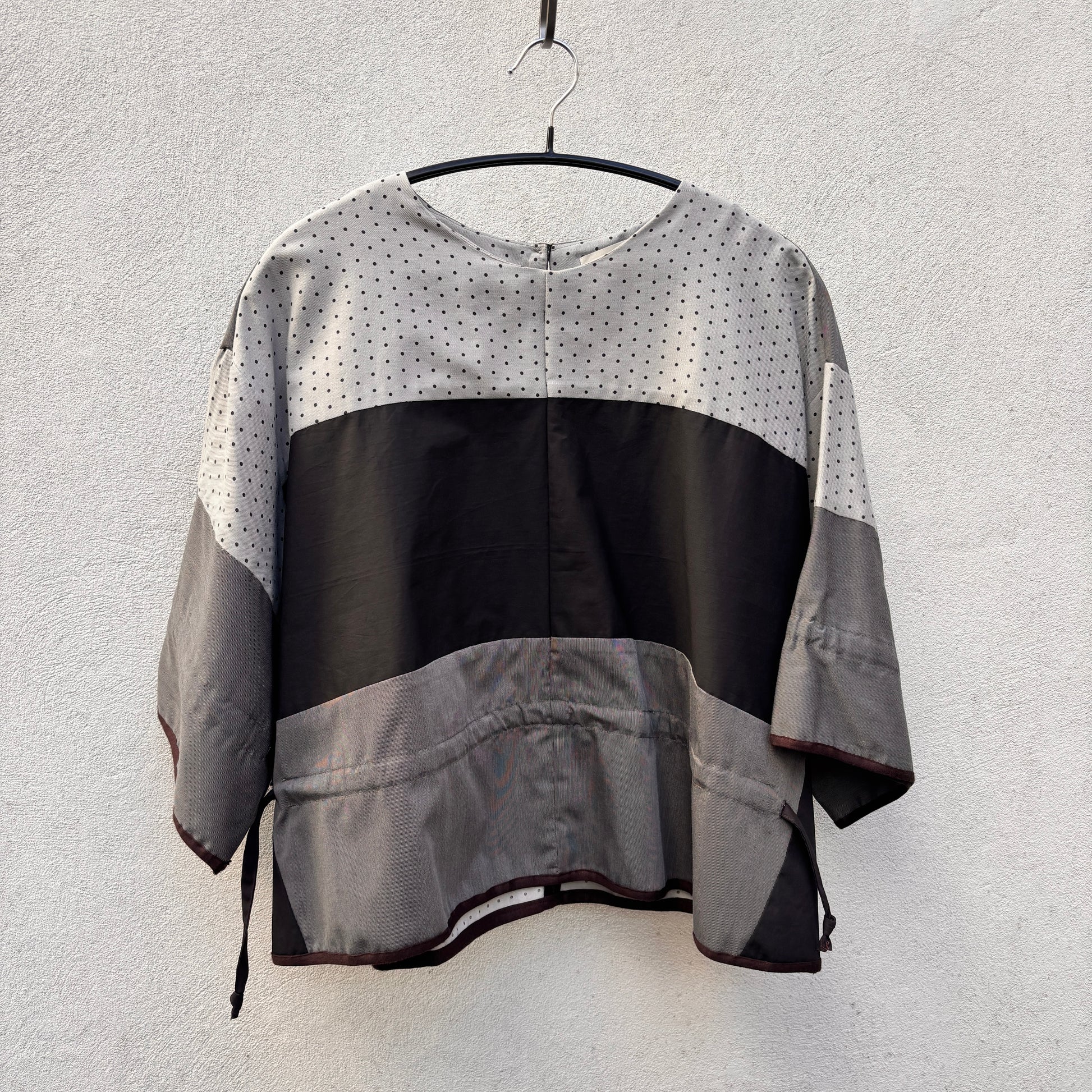 Justerbar Bluse er en unik og alsidig bluse skabt af tre genanvendte herreskjorter, nøje udvalgt for deres farver, mønstre og kvalitet. Designet har et moderne og fleksibelt udtryk med justerbare stropper i både ærmer og talje, så blusen kan tilpasses efter behov. De franske sømme sikrer en behagelig og holdbar finish, mens et dekorativt kantebånd giver et skarpt og stilfuldt look.