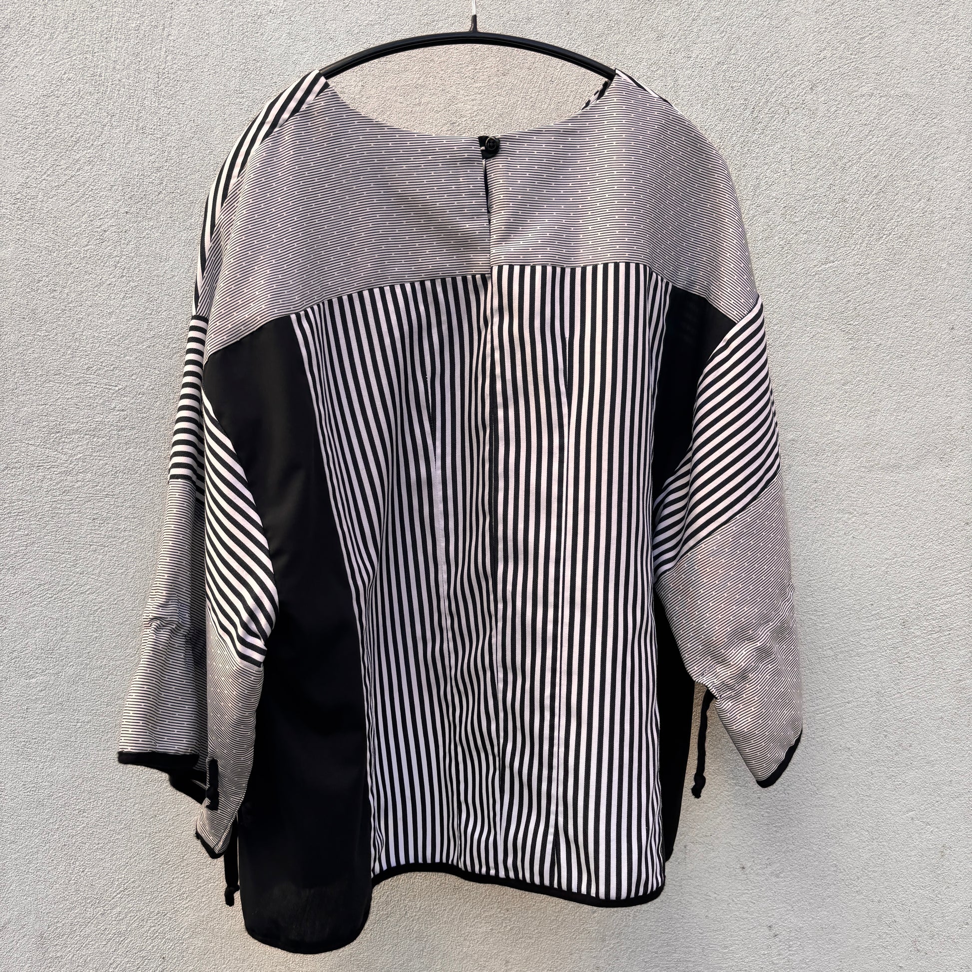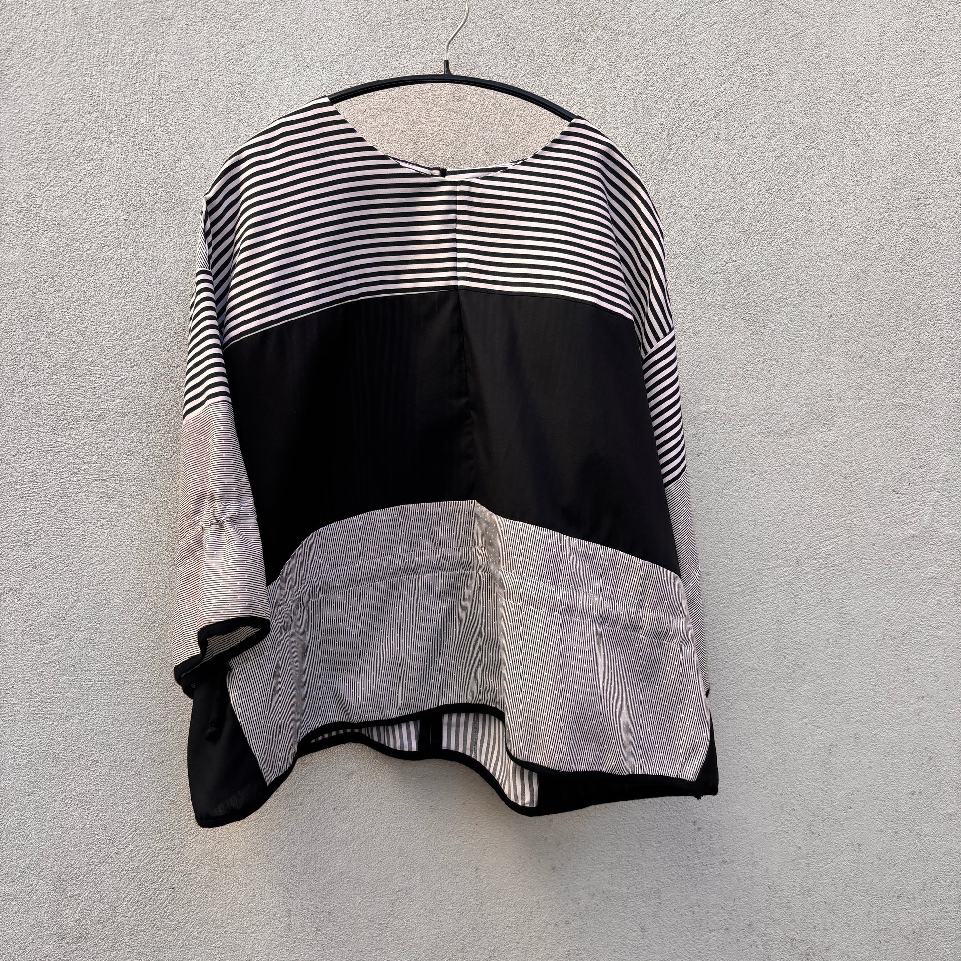 Justerbar Bluse er en unik og alsidig bluse skabt af tre genanvendte herreskjorter, nøje udvalgt for deres farver, mønstre og kvalitet. Designet har et moderne og fleksibelt udtryk med justerbare stropper i både ærmer og talje, så blusen kan tilpasses efter behov. De franske sømme sikrer en behagelig og holdbar finish, mens et dekorativt kantebånd giver et skarpt og stilfuldt look.